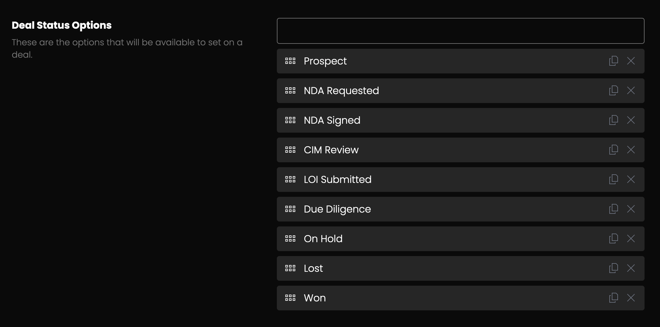 To manage the options, navigate to your Workspace Manage tab and then to the Deal Status Options section. There you'll be able to make any adjustments you'd like.